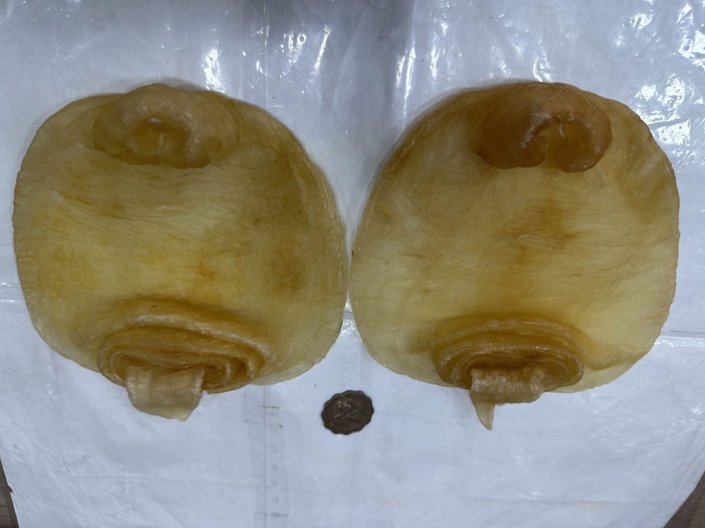 浸發完成後,花膠會明顯變大、變厚。此時用手輕輕洗淨花膠表面的雜質,特別是藏在內側的血筋或油脂(這些是腥味來源),用剪刀修剪乾淨即可。